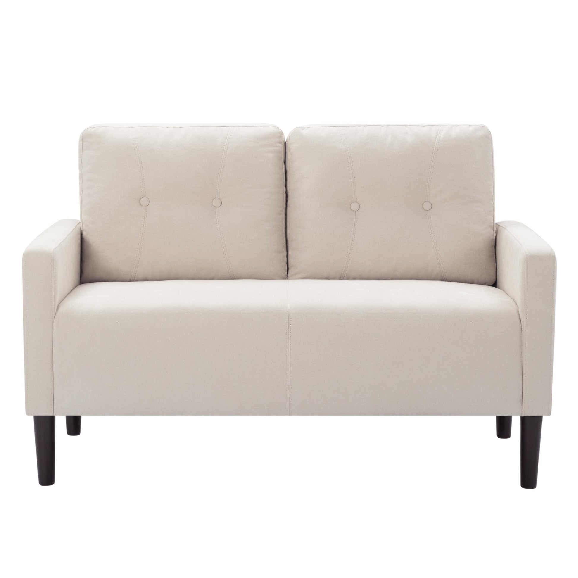 Product Overview Description / Features - 51.2”Loveseat Couch, modern simple and stylish design, this sofa is a pretty addition to small space for living room, apartment, office, cafe and etc. - Designed with a scientifically optimized back angle that provides better sitting experience, and back cushions are removable. - Stability & Durability: solid wood and iron combination of frame making this sofa stable and durable; - Tapered solid wood legs. - 6 colors for choosing. - Hidden package: the parts and hardware are put underneath of the sofa. Please check it before assemble. Caution*** Please do not open the compressed packaging until your sofa frame is completely assembled, otherwise it can’t be repacked in original packing way to return. *** Please review the product dimension and check if it’s suitable for your living room *** It might be have color difference due to photograph lighting, or computer monitor displayed. It’s not quality issue. Product Details Weights & Dimensions Sofa -overall size :51.2” x28”x 33.9”H Product Weight :52.25 LBS Gross Weight :55.12 LBS Carton size :46.06” x19.69” x11.42” Specifications Product Type : Loveseat Design : Standard Seating Capacity : 2 Upholstery Material : Linen Blend Upholstery Colour : Beige, Black, Green, Grey, Light Grey, Navy Blue Assembly Assembly Required : Yes Level of Assembly : Partial Assembly Assembly Time : 20 Minutes Adult Assembly Required : Yes Suggested Number of People : 2 Additional Tools Required : All tools included