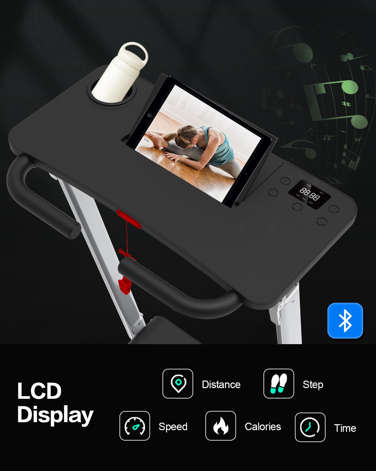 👍【Folding Treadmill with Desk】The folding treadmill has a large desk that you can place a laptop, pad, book and other, the size of desk is 25.2"(L) x 11.8"(W). The built-in multifunctional LCD display tracks your performance including time, speed, distance, calories and step, promising a superior and effective home treadmill workout.